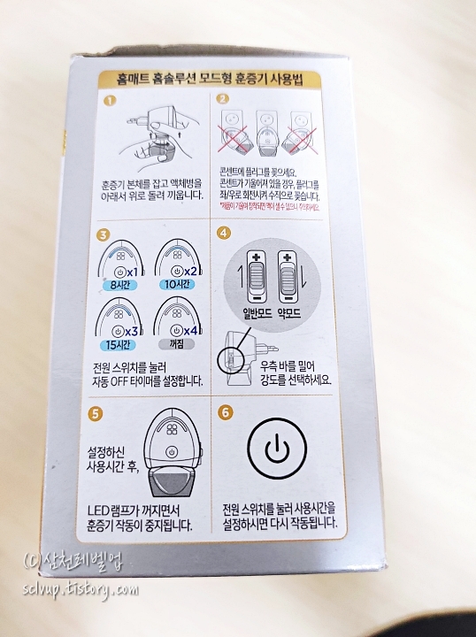 매번 홈매트 리필 150매 같은 걸 사서 갈아 끼우느라 피곤했는데 확실히 오래가는 훈증기가 편합니다. 타이머 되고 모드 조절되고 냄새도 없고 깔끔하네요. 한 가지 아쉬운 점은 눕혀서 꼽고 오래 쓰니 세지는 않는데 훈증기 윗부분에 살짝 액체가 보이는데 그게 약간 흐르는 듯합니다. 사용 시 똑바로 세워서 사용하라고 되어 있네요.