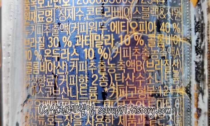원재료를 보면 추출액의 커피원두가 에티오피아 40%, 브라질 30%, 과테말라 10%, 콜롬비아 10%, 온두라스 10%로 상당히 섞여 있네요. 단일 산지 원두의 오리진 아메리카노 같은 커피도 있는데 이 커피처럼 섞여도 진하고 맛 좋으면 괜찮은 것 같습니다. 콜롬비아산과 브라질산 커피추출농축액이 쓰였고 커피향 2종의 합성향료와 탄산수소나트륨, L-아스코브산나트륨이 사용됐습니다. 커피고형분은 1.21%이네요. 다양한 산지 원두로 균일하고 퀄리티 있는 맛을 내는 게 포인트네요.